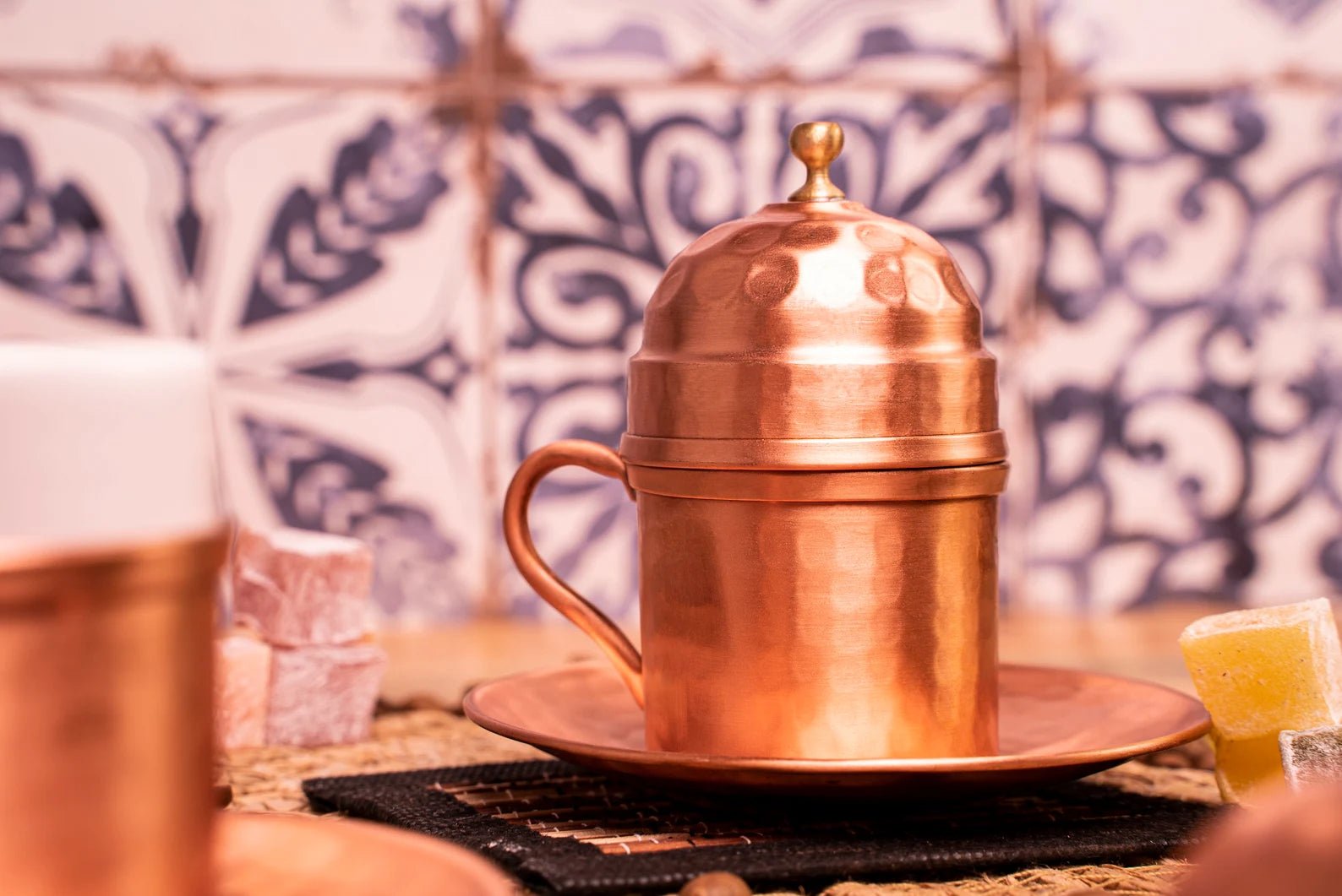 Sada tureckého měděného šálku na kávu a víka s talíři (6 kusů)