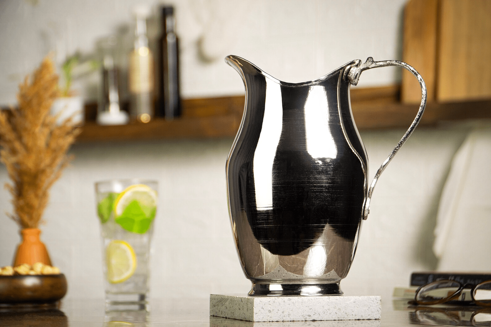 Upgrade your hydration experience with the Handmade Copper Pitcher in Silver Color, a refined blend of artisanal craftsmanship and everyday functionality. Expertly crafted from 100% pure copper using traditional cold-forging techniques, this pitcher features a thick, hand-hammered surface finished in a sleek silver tone. Its 1500ml capacity makes it ideal for serving water at the table, keeping a bedside supply, or adding a statement piece to your décor. Built for a lifetime of use, it offers both beauty and the potential health benefits of copper.
