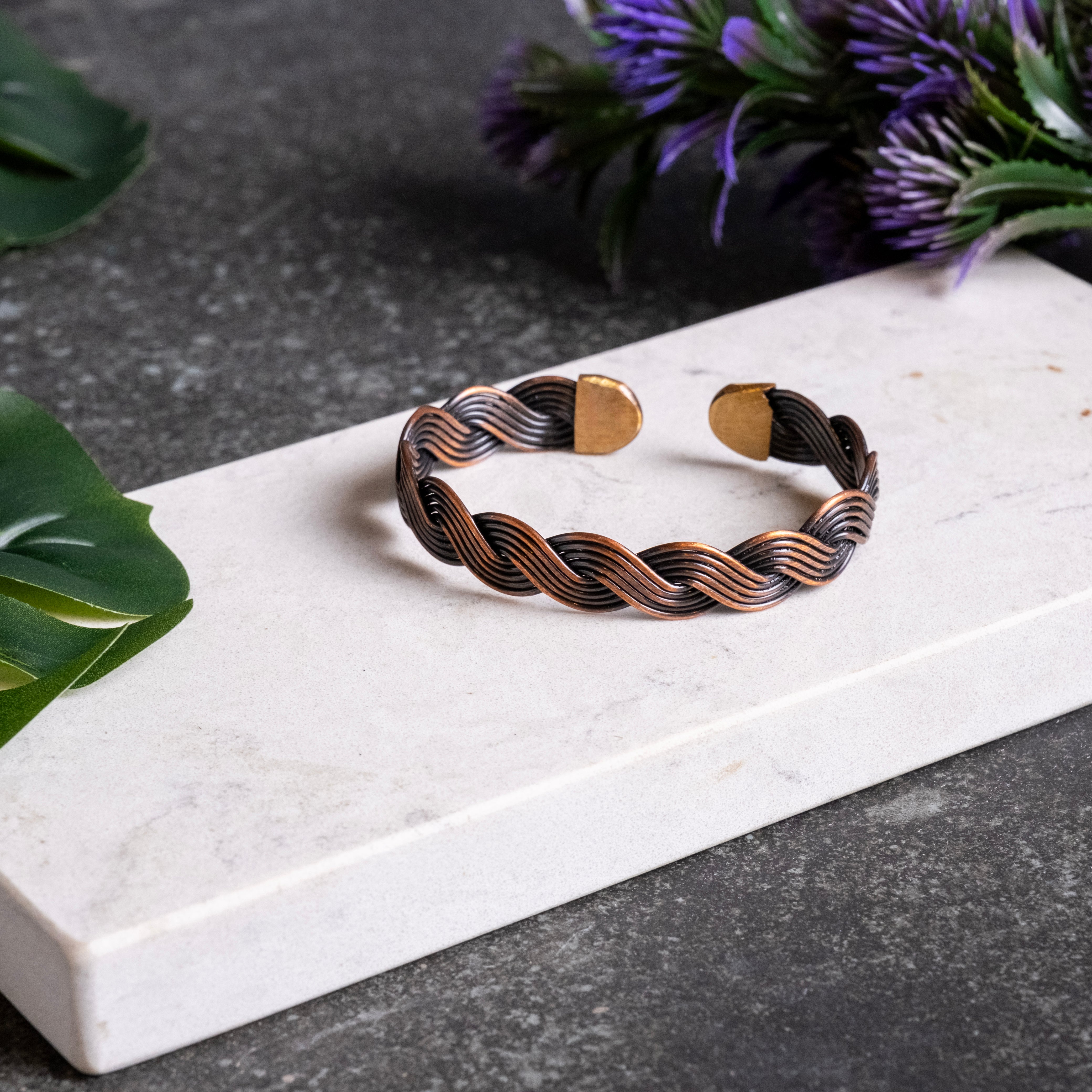 Braided Dark Copper Healing Bracelet, Open Cuff Design with Golden End Caps