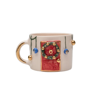 Handcrafted Christmas Red Door Ceramic Mug With Holiday Accents